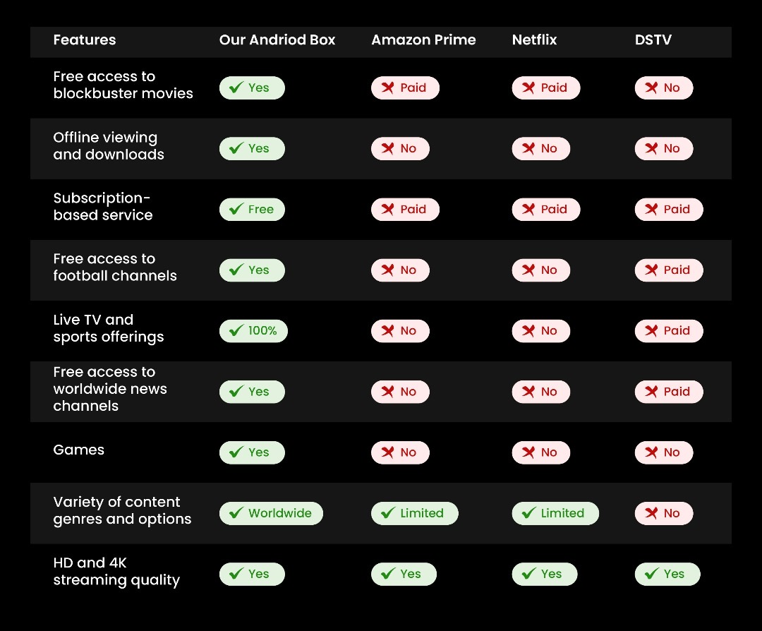 Enjoy FREE Access to ALL Football Matches. Are you a football lover? With this Android Box, you get exclusive and free access to all football leagues, and international football matches from around the globe. Forget about the hassle of expensive subscriptions and never missing a match again. From breathtaking goals to incredible saves, it will be right there on your TV screen, FOR FREE.